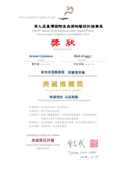 Je suis ravie, fière et honorée de vous partager avec vous que "The bird of egg" a reçu le PRIX DES COLLECTIONNEURS durant le « 9th Taiwan International Gold Teapot Prizes » (prix international de la théière en or de Taïwan)